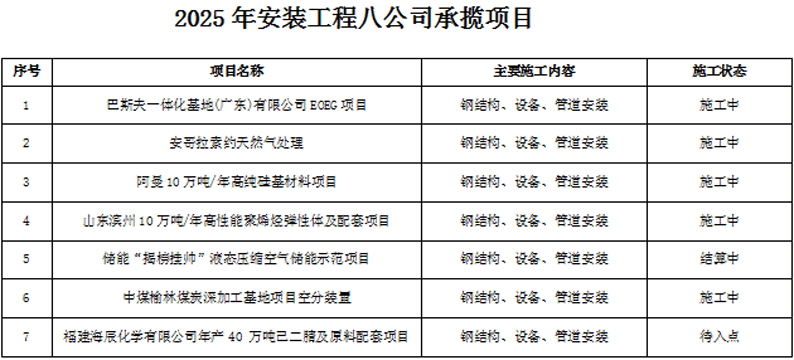 安裝工程八公司近年來專注于石油化工、煤化工、精細化工等核心領(lǐng)域的安裝工程,主要承接空分、氣化、乙烯、醋酸、甲醇、多晶硅、煉油廠等各類重點項目。2025年專業(yè)公司在建項目7個,主要從事鋼結(jié)構(gòu)、設(shè)備安裝、管道安裝,以質(zhì)量為抓手,扎實推進項目質(zhì)量管理各項工作。