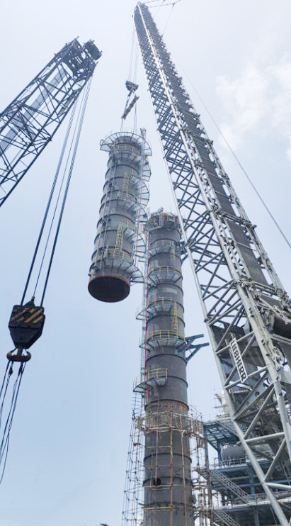 安徽嘉璽苯乙烯裝置第一粗苯塔成功吊裝就位