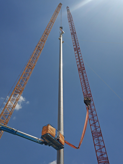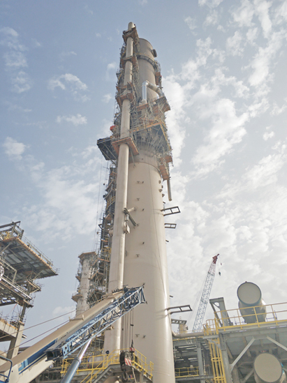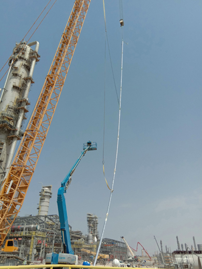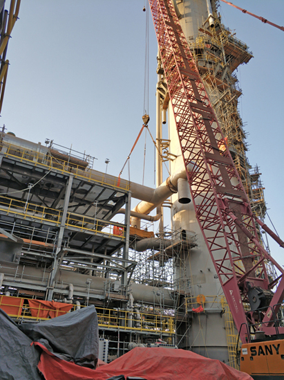疫情發生以來,現場人員、機械等資源使用受到很大限制,土建單位停工造成了場地不具備安裝條件。項目隊優化人力資源組合,科學規劃作業內容。技術人員對施工方案、作業流程以及可能出現的各種狀況進行充分探討、論證,準備了各類預案,保障了施工順利完成。例如,在場地受限、大型吊裝機械無法滿足數量要求,且唯一一臺大吊車無法到達最優作業位置的情況下,項目隊仍然成功完成70多米再生塔頂層超大平臺跨主管廊安裝。此外,由于設計理念的原因,現場工藝設備口配管幾乎均為焊接型,且大部分具有特殊角度,大大增加了作業難度。技術人員積極與總包探討,據理力爭,通過增加焊口,或者修改現場口位置,甚至將已完成的預制口切口、避開特殊角度等方式,成功完成100多米洗滌塔多條超高空大口徑附塔管及異形大口徑管段安裝等多項重難點施工任務。