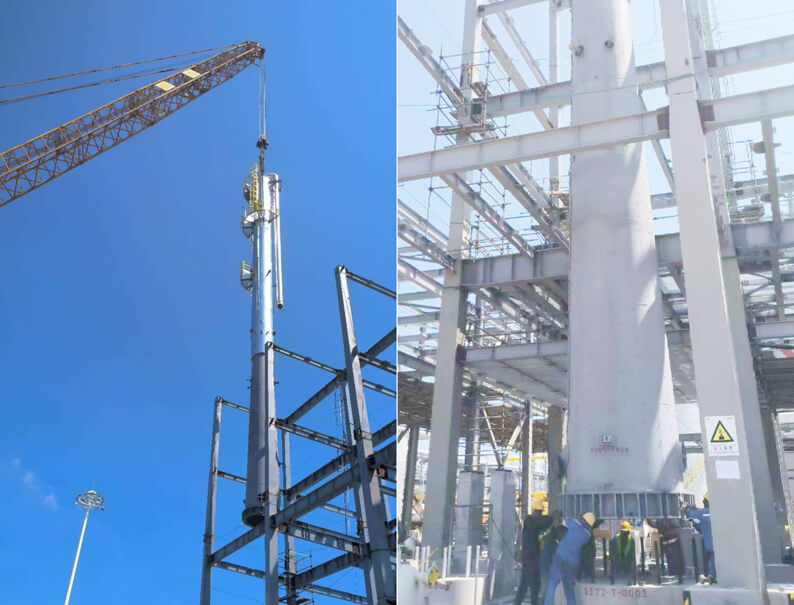 本次吊裝的預精餾塔設備規格為直徑1.5米×39.955米,重量為22.75噸。經對認真勘測和科學、嚴謹的技術論證,本著穩妥可行、安全可靠、技術成熟、經濟合理的原則,項目部采用 650噸履帶式吊車作為主吊,200噸汽車吊溜尾配合的提升吊移抬送法進行吊裝。項目部管理團隊在現場有條不紊指揮,施工人員按照規范要求精細操作,最終順利完成大件吊裝任務。這一階段性成果的取得,不僅標志著項目建設邁出至關重要的一步,更為后續建設快速推進鋪平了道路。
