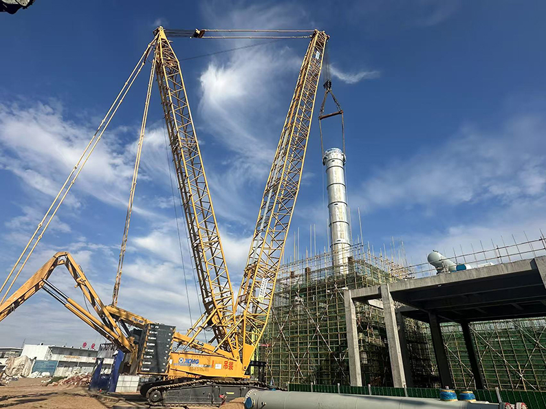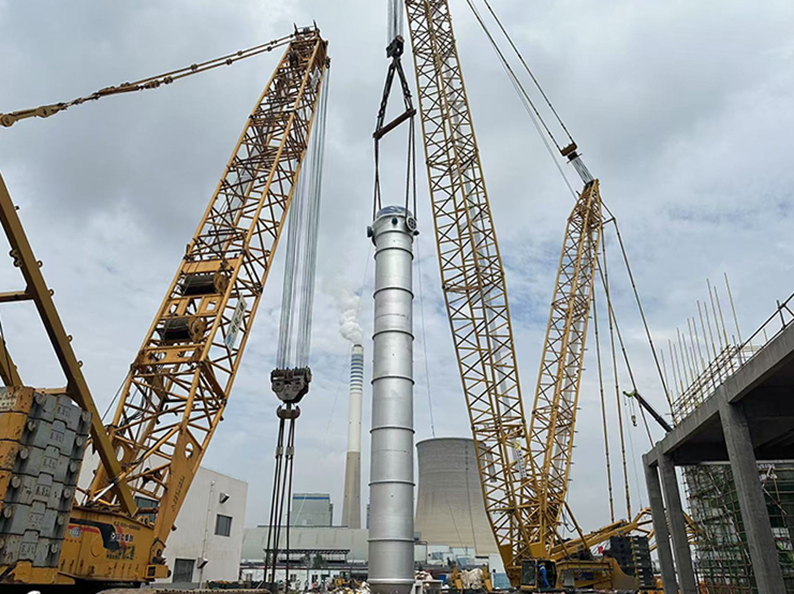 氨合成塔作為項目核心設備,總長27.6米,總重達338噸,此次吊裝作業采用400噸和800噸兩臺大型履帶吊協同作業,采用單主機抬吊遞送法的吊裝工藝進行吊裝,即800噸履帶吊作為主吊車提升設備的頭部,400噸履帶吊配合溜尾抬送設備的尾部,兩臺起重機先將設備抬起,主吊車負責提升設備,溜尾吊車負責向前遞送。為確保吊裝安全高效,項目團隊提前三個月制定詳細吊裝方案。技術人員通過反復測算設備重心、吊點受力及兩臺吊車的協同參數,針對可能出現的風速突變、受力失衡等風險制定應急預案,施工前組織專項檢查、方案交底,對吊車性能、吊具強度進行全面檢測,為吊裝作業筑牢安全防線。憑借精準的計劃部署與精湛的技術操作,項目部圓滿完成這一高難度任務。