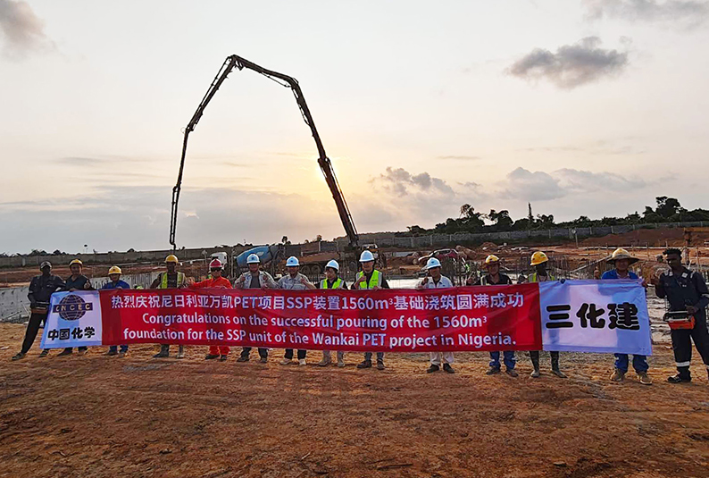 尼日利亞(拉各斯)有限公司承建的尼日利亞萬凱PET項目固相縮聚(SSP)裝置筏板基礎大體積混凝土澆筑任務圓滿完成。項目所在國尼日利亞大體積砼澆筑“高端短缺”的結構性矛盾突出尖銳,商混站稀缺且保供能力差,市政道路路況差并常態堵車。項目部多次召開專題會議,研究合適的澆筑時間,外調備用泵車和罐車,預演澆筑可能出現的突發狀況,策劃周全的防控措施,堅持一體化管控,持續作業28小時,最終確保此次澆筑取得成功,為項目的推進奠定了堅實基礎,贏得了業主的廣泛好評。