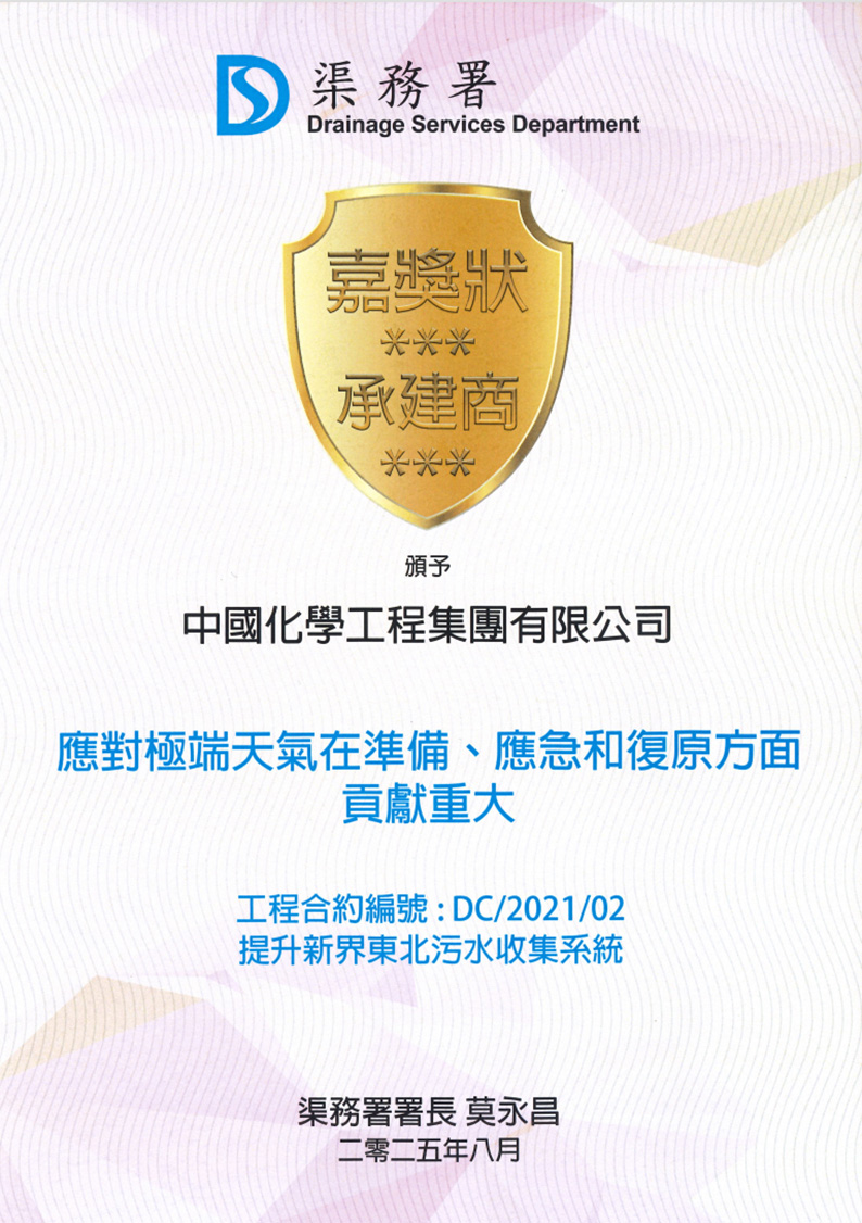 近日,香港特區政府渠務署向中國化學工程第三建設有限公司香港公司頒發嘉獎狀,高度肯定其在臺風“韋帕”及“黑雨”極端天氣下沖鋒在前、高效搶險的專業表現,為守護香港市民生命財產安全貢獻“央企力量”。